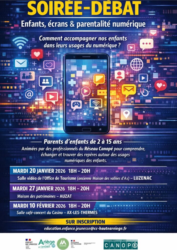 Pour accompagner les parents dans ce cheminement réflexif, pour les amener à être acteurs du numérique auprès de leurs enfants, la communauté de communes de la Haute-Ariège organise, dans le cadre du projet « Territoire Éducatif Rural (TER), un cycle de trois conférences-débats sur la thématique de la « Parentalité numérique ».