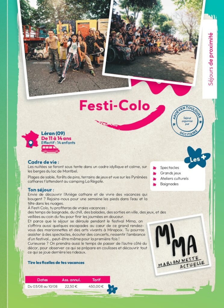 Séjour ados (11-14 ans) organisé en partenariat avec MIMA, festival de marionnettes. Nuitées sous tente sur les berges du lac de Montbel à Léran.